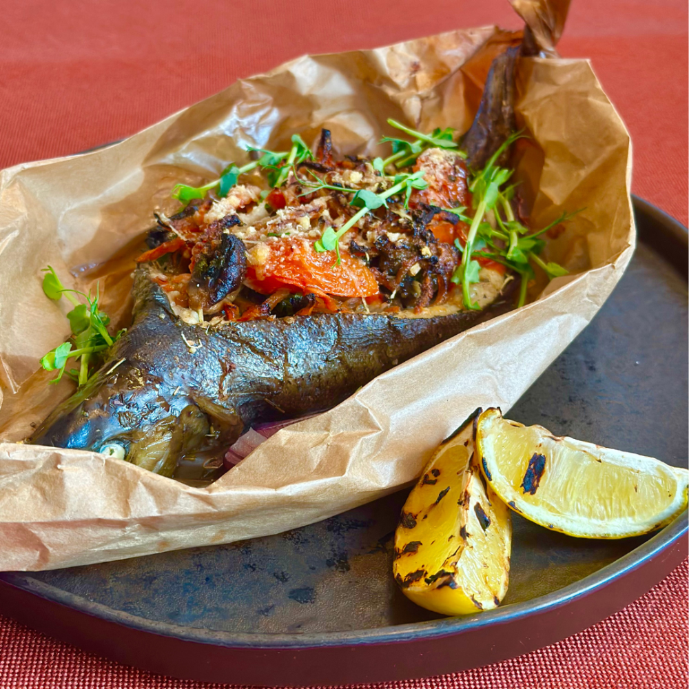 Окунь запечений в гірчичному соусі з медом та шпинатом